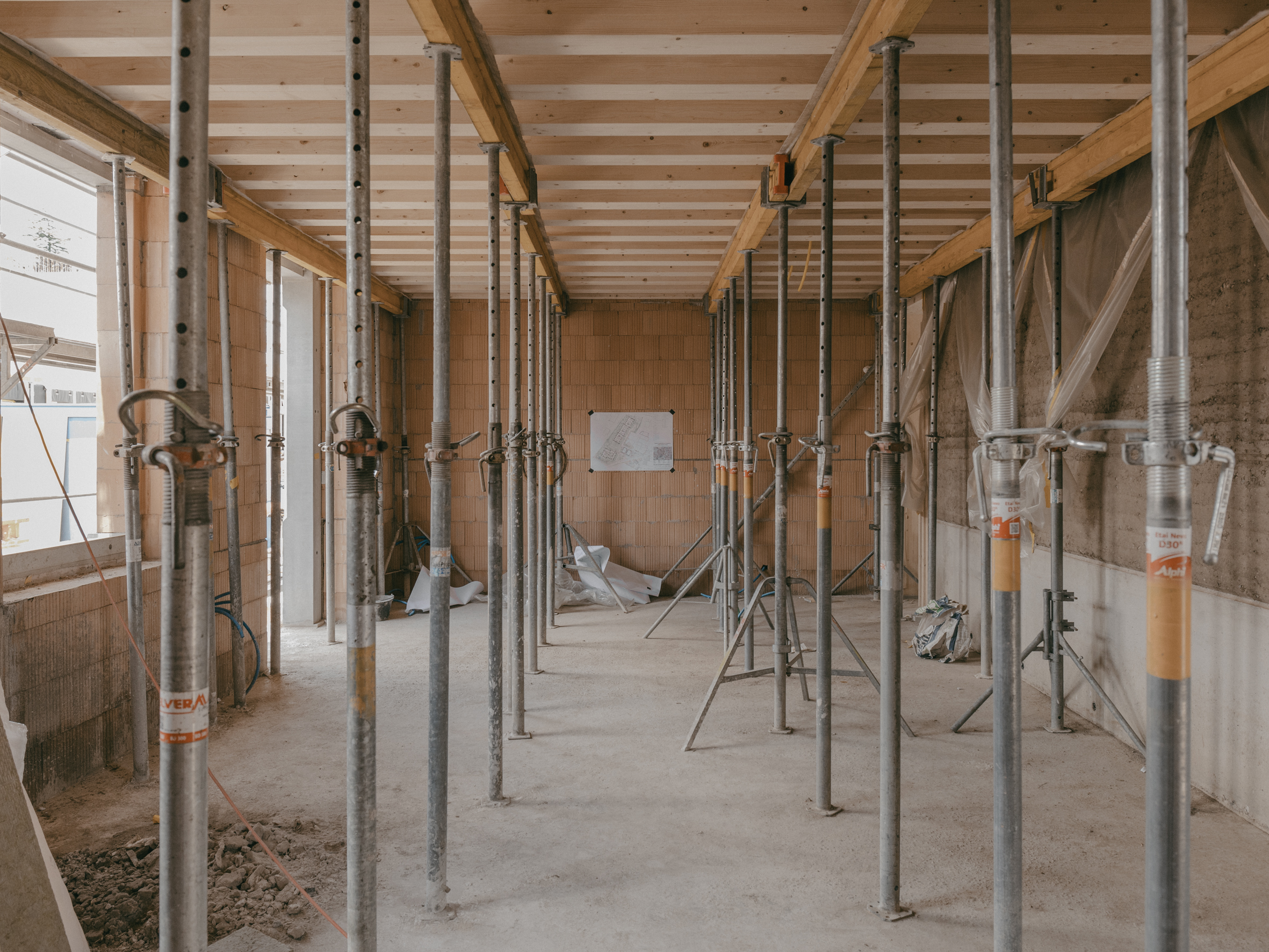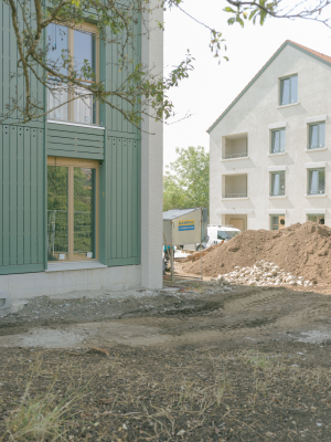 Les trois nouvelles constructions dialoguent par leurs systèmes constructifs complémentaires. Le premier bâtiment, longitudinal, associe une façade et de larges balcons en bois à des murs porteurs en CLT soutenant une dalle mixte bois-béton. Le second, rayonnant, se distingue par sa façade en briques isolantes revêtues d’un crépis minéral traditionnel. Le troisième, à vocation publique, présente une façade en briques isolantes doublée à l’intérieur d’un habillage bois évoquant l’intériorité des anciennes constructions rurales. Deux murs porteurs intérieurs, en terre crue issue du site, supportent les solives du plancher de l’étage.