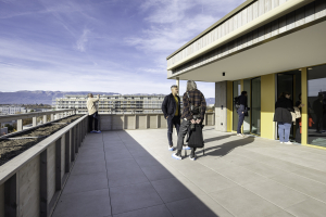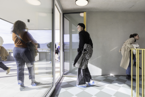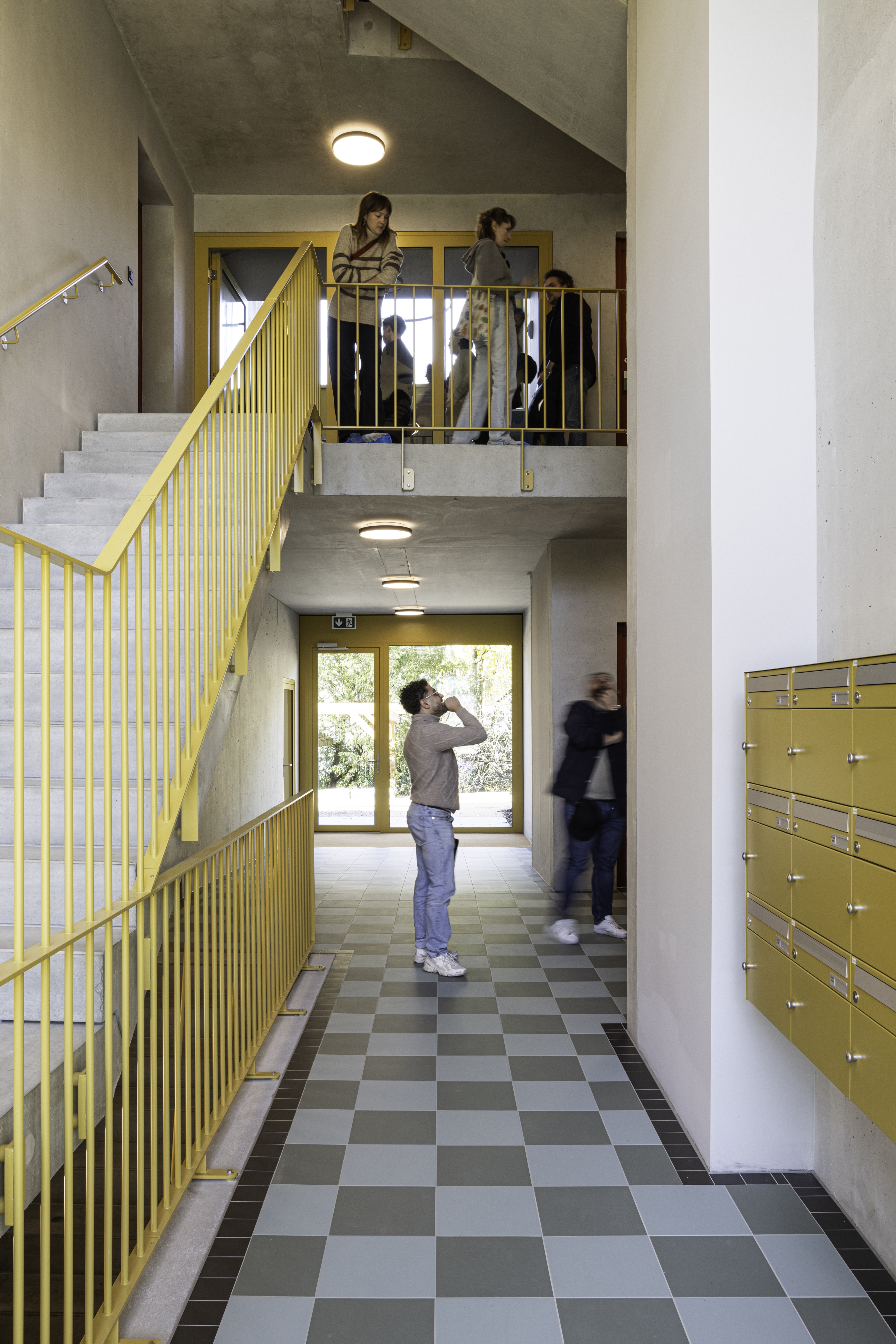 Les deux allées se relient par le rez-de-chaussée traversant qui accueille une salle commune, une buanderie, deux locaux vélos, ainsi que trois logements. Chacune des deux allées bénéficie au 1er étage d’un espace commun à la disposition des habitants. En toiture, une terrasse commune agrémentée de potagers offre un espace de rencontre jouissant du soleil et de la vue.