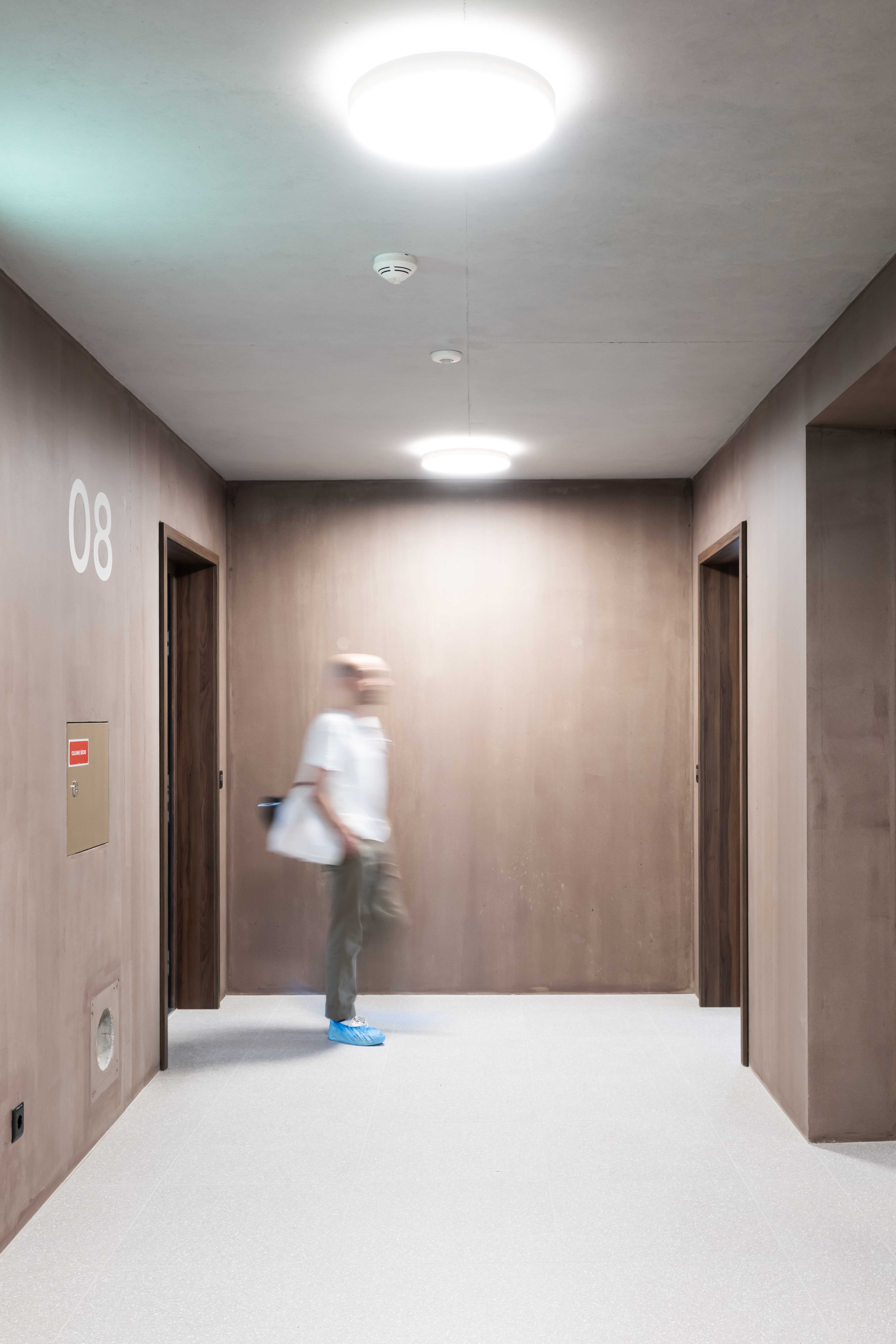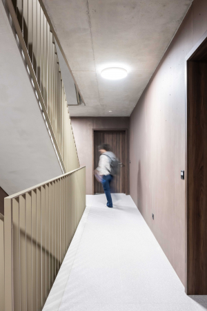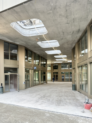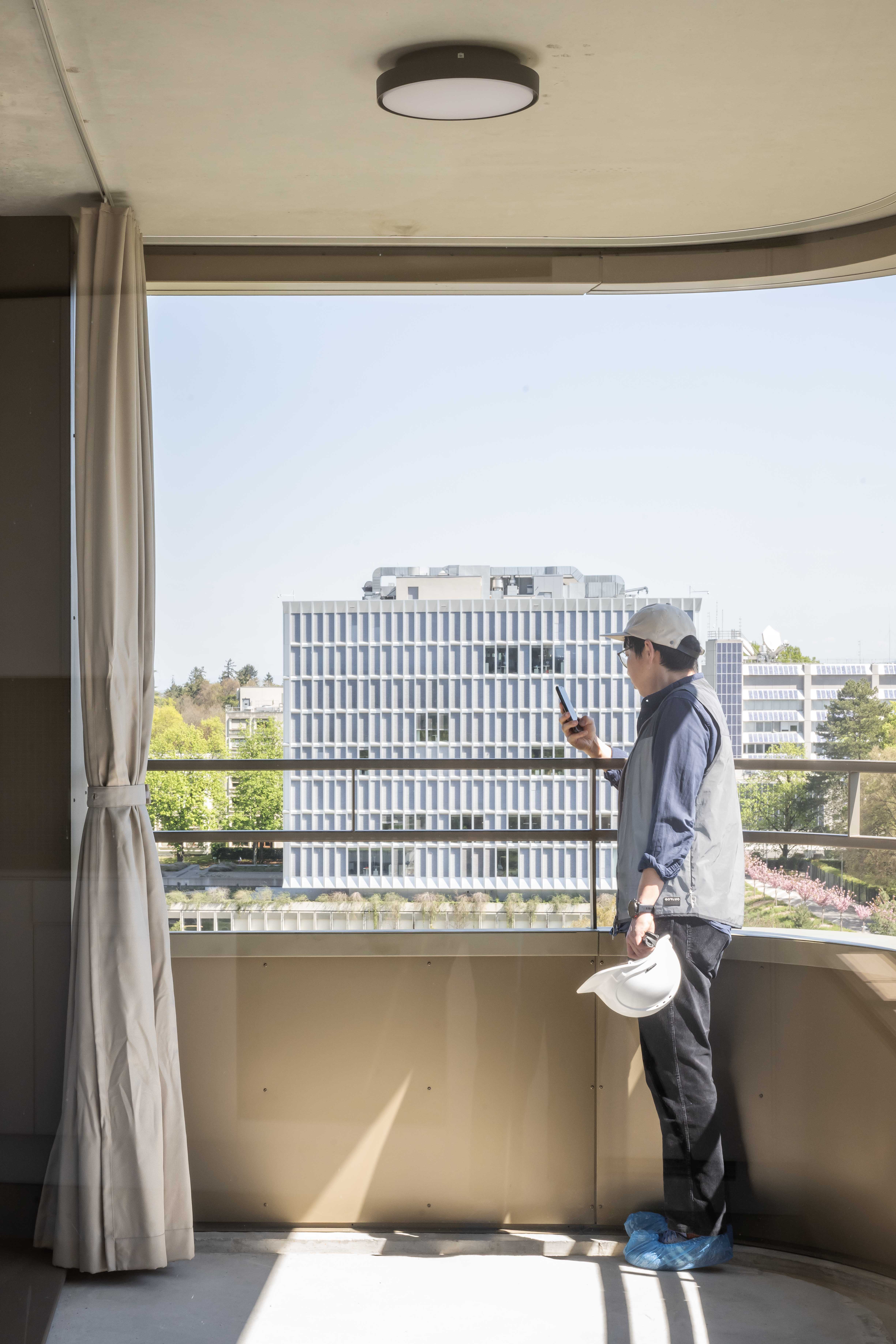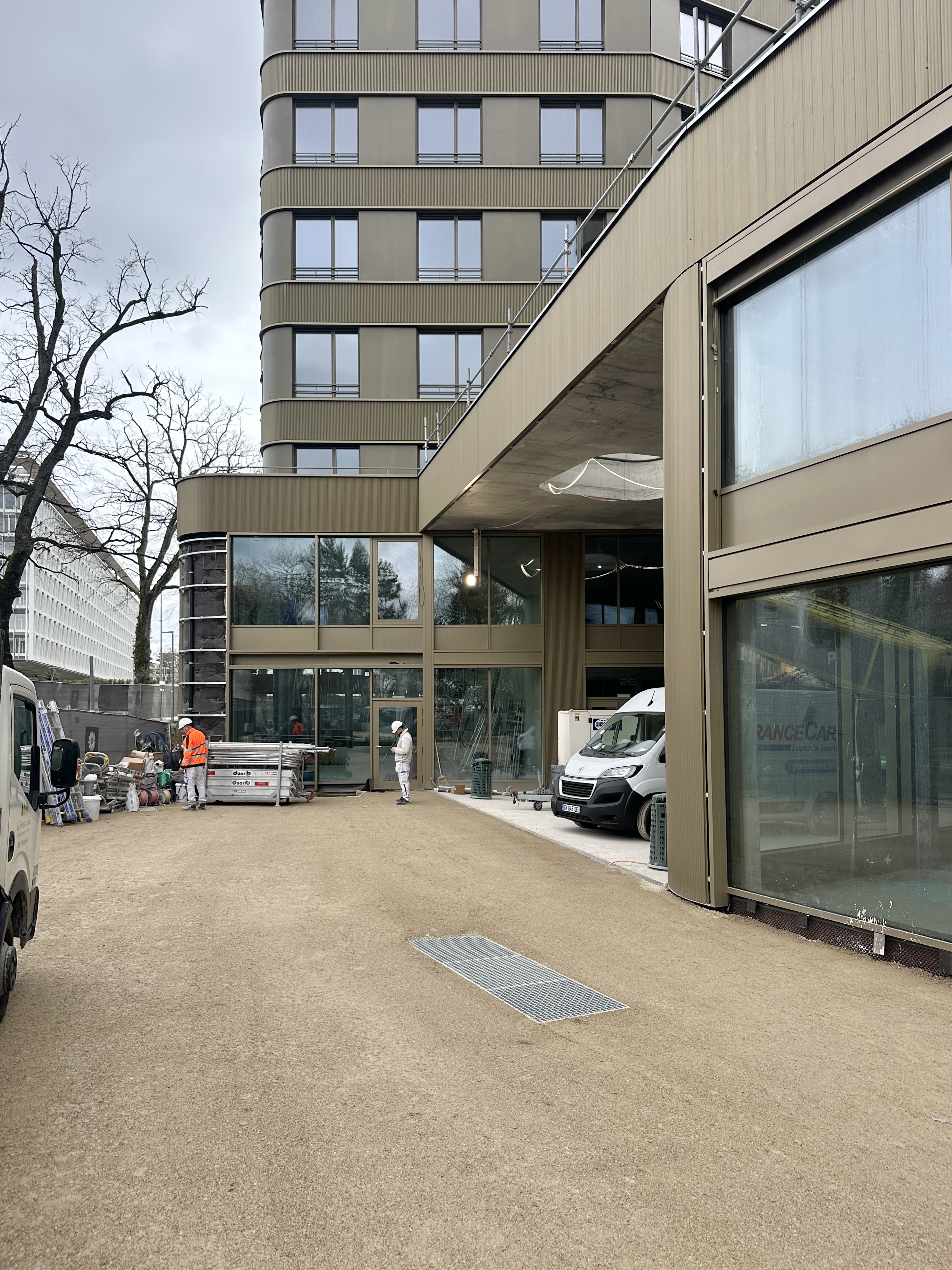 continue du socle, les volumes forment un ensemble et se mettent à l’échelle des bâtiments isolés des organisations internationales. Posé dans une clairière, le projet crée une urbanité de quartier avec des espaces