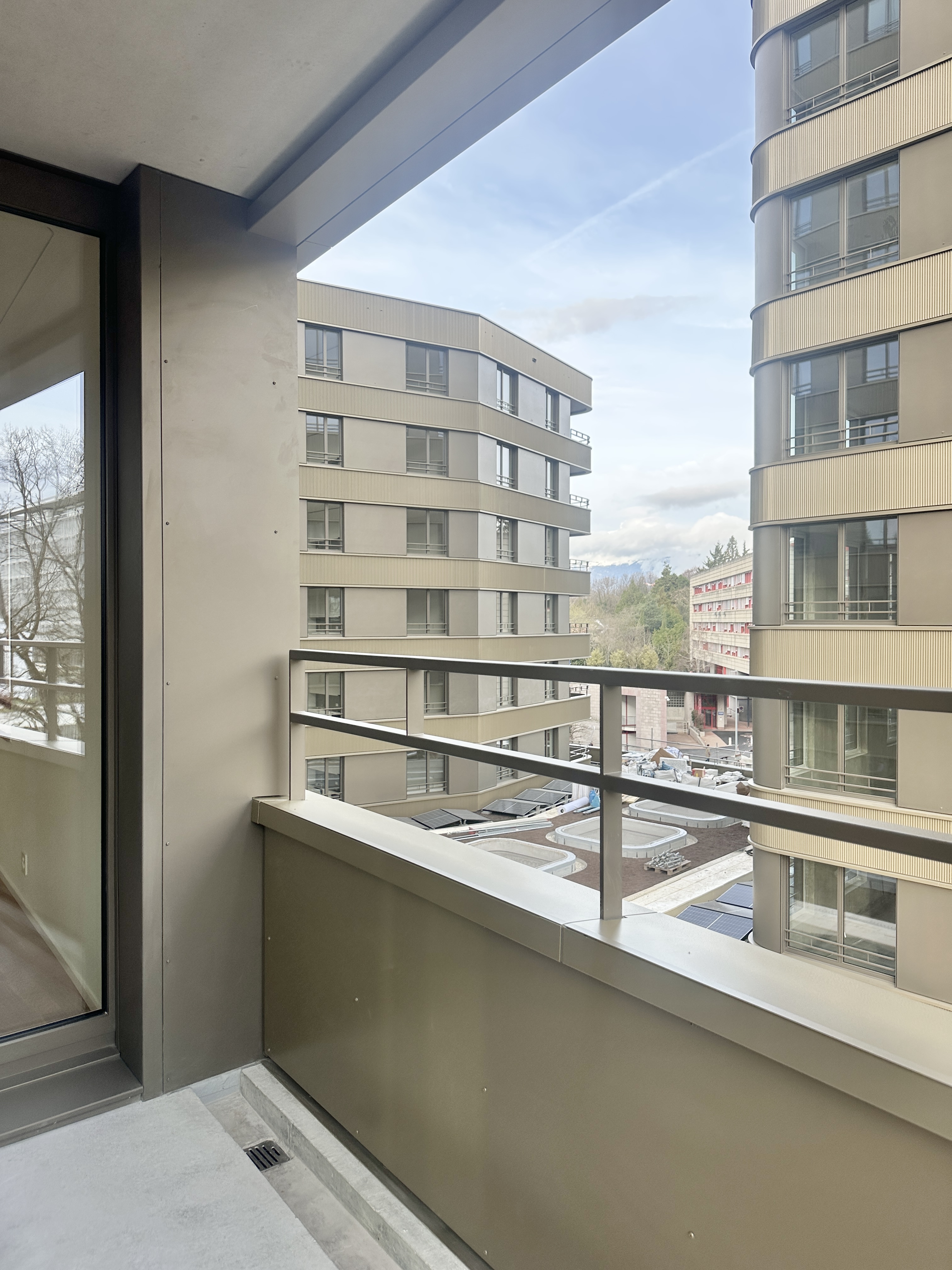 intégrante de la forme urbaine. Très perméable côté Route des Morillons, traversable ponctuellement côté Avenue Appia, elle devient un élément constitutif de l’îlot. La dimension de l’emprise au sol des socles tout comme le passage mettent à distance les logements situés dans les étages supérieurs, afin d’assurer suffisamment d’intimité. Des appartements bi-orientés sont distribués par une cage centrale. La typologie rayonnante, avec un espace jour qui s’articule autour d’une loggia, assume les proximités tout en offrant des dégagements lointains. Renforçant la position panoramique du projet, la façade est composée d’une alternance de bandeaux horizontaux de deux teintes différentes. En fonction de l’orientation et de la luminosité, la couleur bronze de la tôle pliée du socle et des bandeaux renvoie des reflets changeant au cours de la journée et des saisons.
