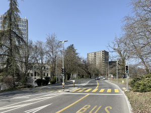 cadre du projet de Jardin des Nations et plusieurs projets sont en cours dans le secteur. Situé à l’angle de la Route des Morillons et de la Route des Nations, qui a récemment pris de l’ampleur en devenant un axe de liaison routier fondamental, le site est au cœur de la transformation urbaine qui s’opère. Répondant à une mixité programmatique, le projet est composé d’une forme urbaine articulée entourée d’un écrin arboré remarquable. Trois bâtiments de logements et d’activités de hauteurs variables sont disposés en quinconce et sont reliés par un passage commercial composé de deux niveaux. Par la proximité des bâtiments et la lecture