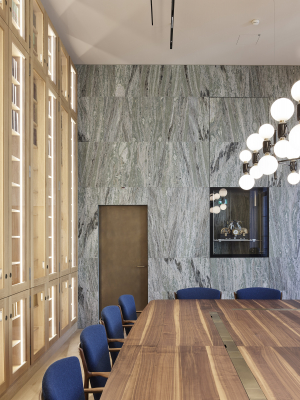 La chaleur du bois utilisé dans la salle est conjuguée avec la fraîcheur apportée grâce à l’important travail opéré sur la lumière, tant naturelle qu’artificielle. Les parois en lames de chêne massif contribuent également au confort acoustique. Le mobilier fixe, la tribune présidentielle et les pupitres, également en chêne, complètent et unifient architecturalement le nouvel ensemble dont l’atmosphère se veut simultanément solennelle par ses dimensions et confortable par sa matérialité. Deux massifs recouverts de marbre vert, situés à deux extrémités de la salle, assurent une fonction structurelle et contiennent des locaux de service, dont l’ascenseur et un nouvel escalier.