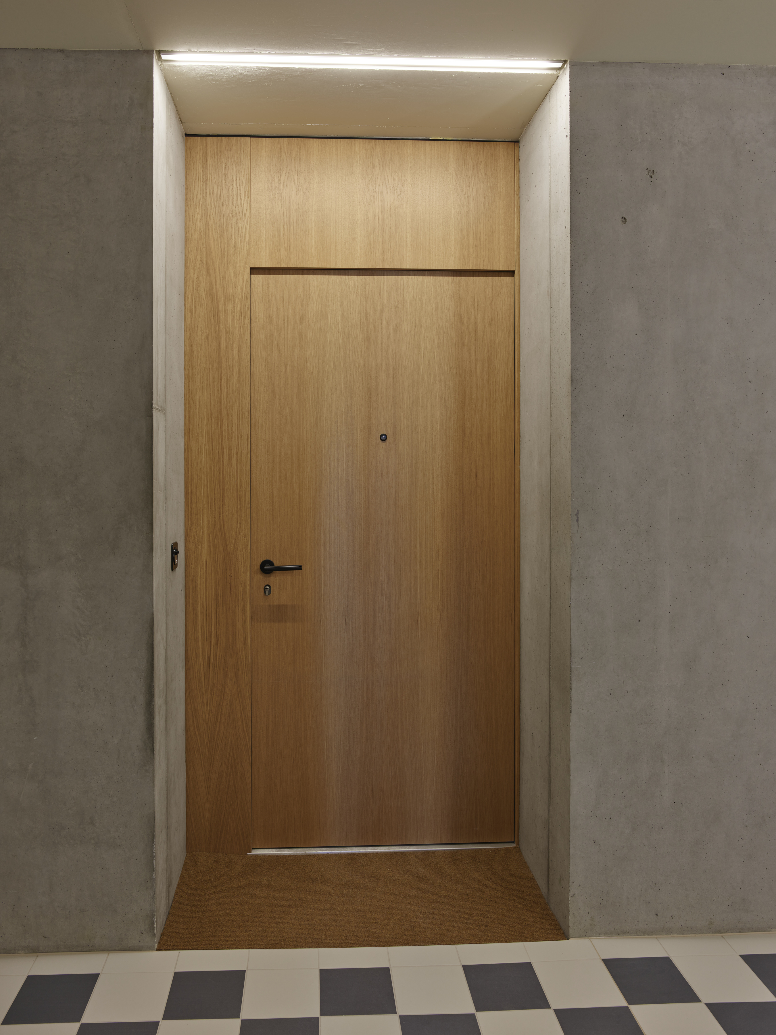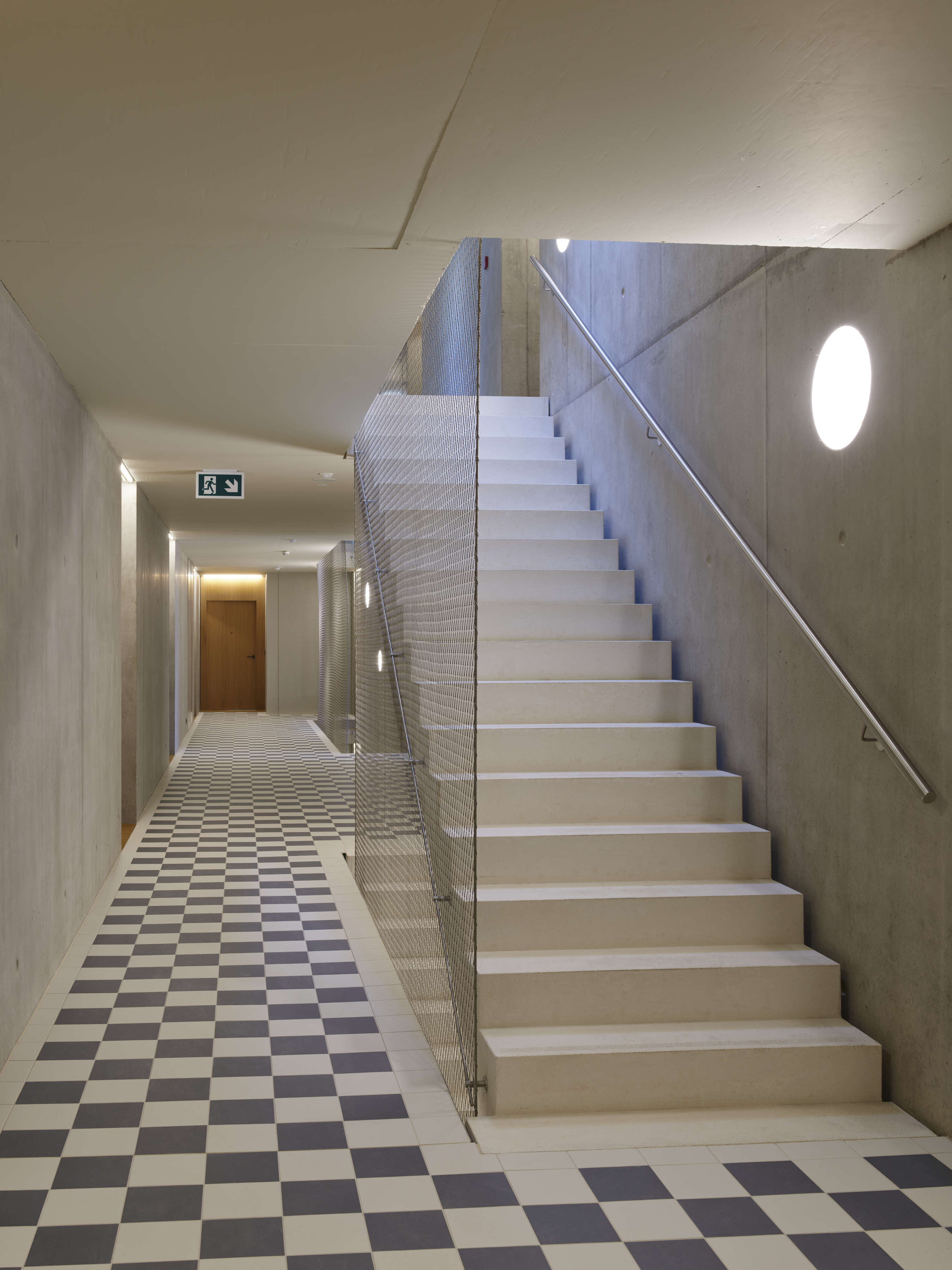 A l’intérieur du bâtiment, les halls d’entrée et les cages d’escalier, espaces généreux de rencontre, ont leur identité propre, composée par la singularité du carrelage en damier qui rappelle le thème des façades. Des retours dans les murs en béton des étages permettent de former des niches pour les entrées des appartements, espaces transitionnels d’accès à chaque logement à l’échelle de l’habitant.