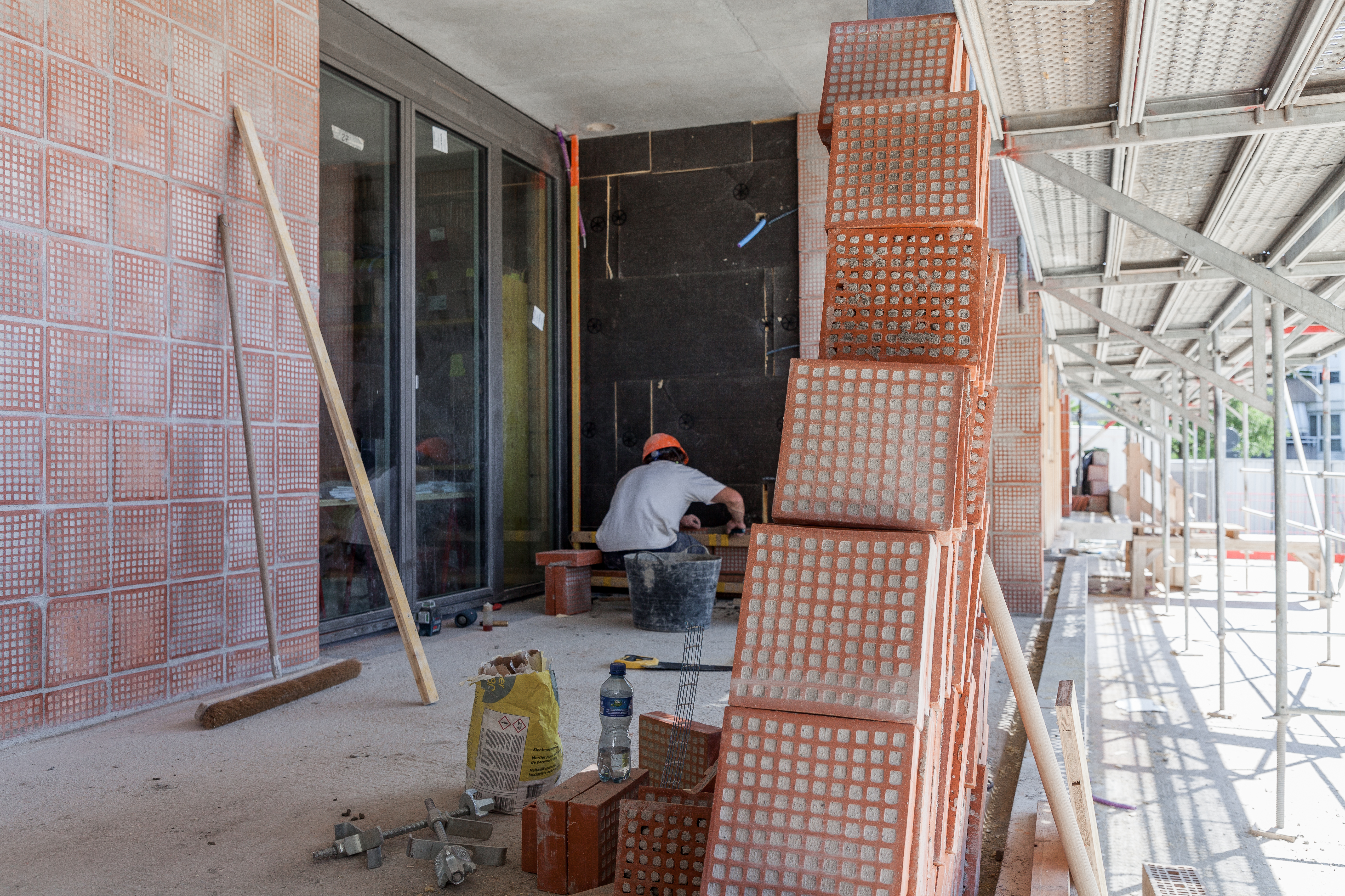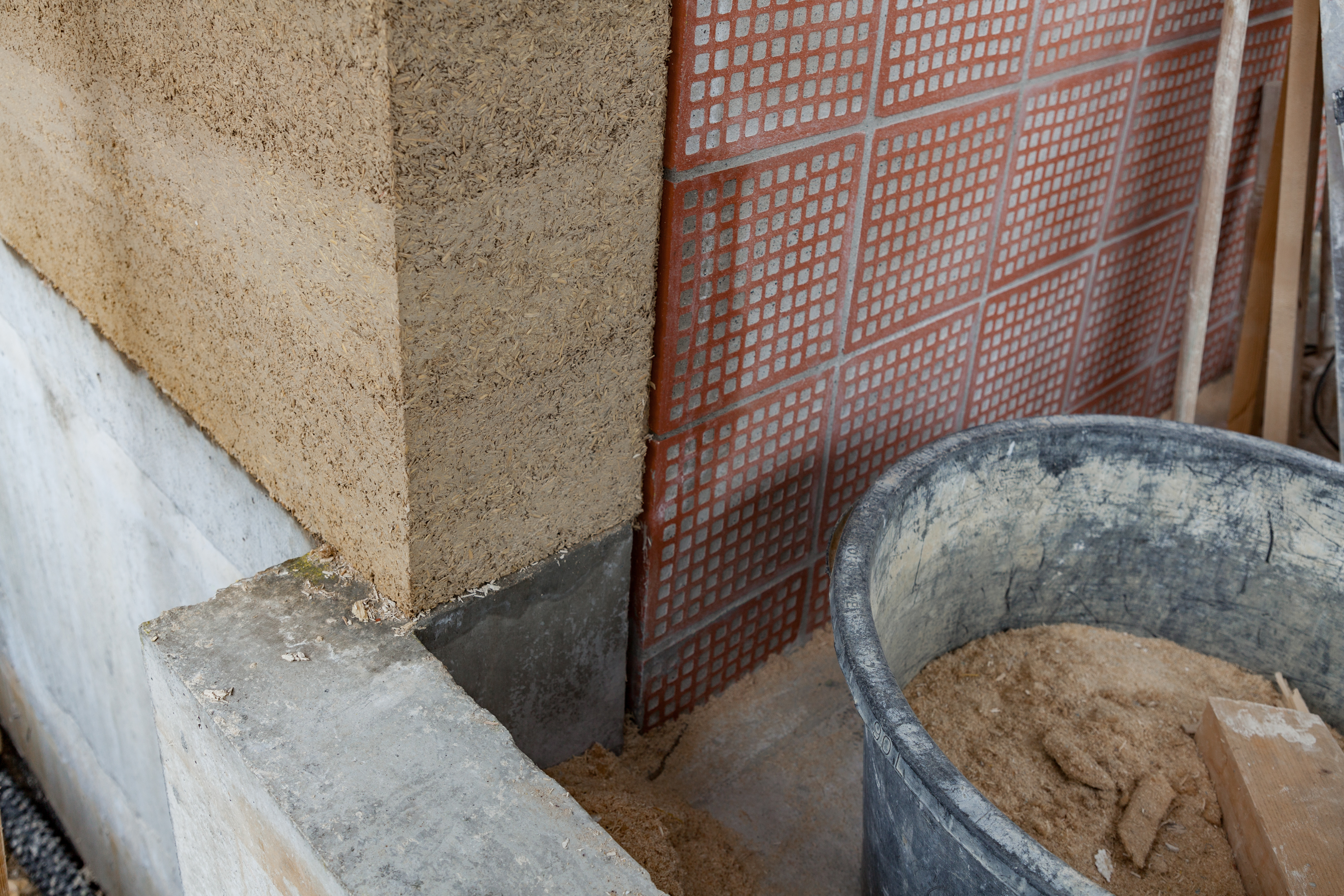 La construction fait intervenir une maçonnerie traditionnelle en terre cuite, constituant les murs de façades, murs porteurs et non porteurs intérieurs. Les façades sont recouvertes recouverte d’une couche de chaux-chanvre banché à la fois isolation thermique et revêtement extérieur. Le projet cherche à limiter les couches de la construction et l’expression architecturale extérieure met à l’honneur les matériaux bruts. Les prolongements extérieurs se manifestent par un traitement différencié, qui met cette fois la brique en parement pour appuyer leur caractère domestique.