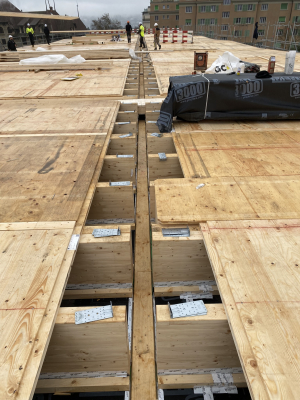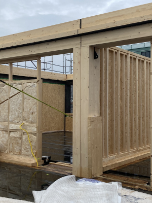 Le principe de la surélévation est d’être préfabriquée afin de limiter les délais de travaux de construction. La structure poteau-poutres est fermée avec des caissons en bois préfabriqués. Ces caissons sont constitués de chevrons porteurs en bois lamellé-collé assemblés avec des panneaux OSB, permettant d’assurer le diaphragme de la toiture. L’ensemble des efforts, sont transmis par les poteaux bois et tirants métalliques, liés à la structure métallique par des assemblages de type tiges collées métalliques et boulonnées sur la platine de support, qui elle est soudées en atelier à la structure métallique par le charpentier métallique.