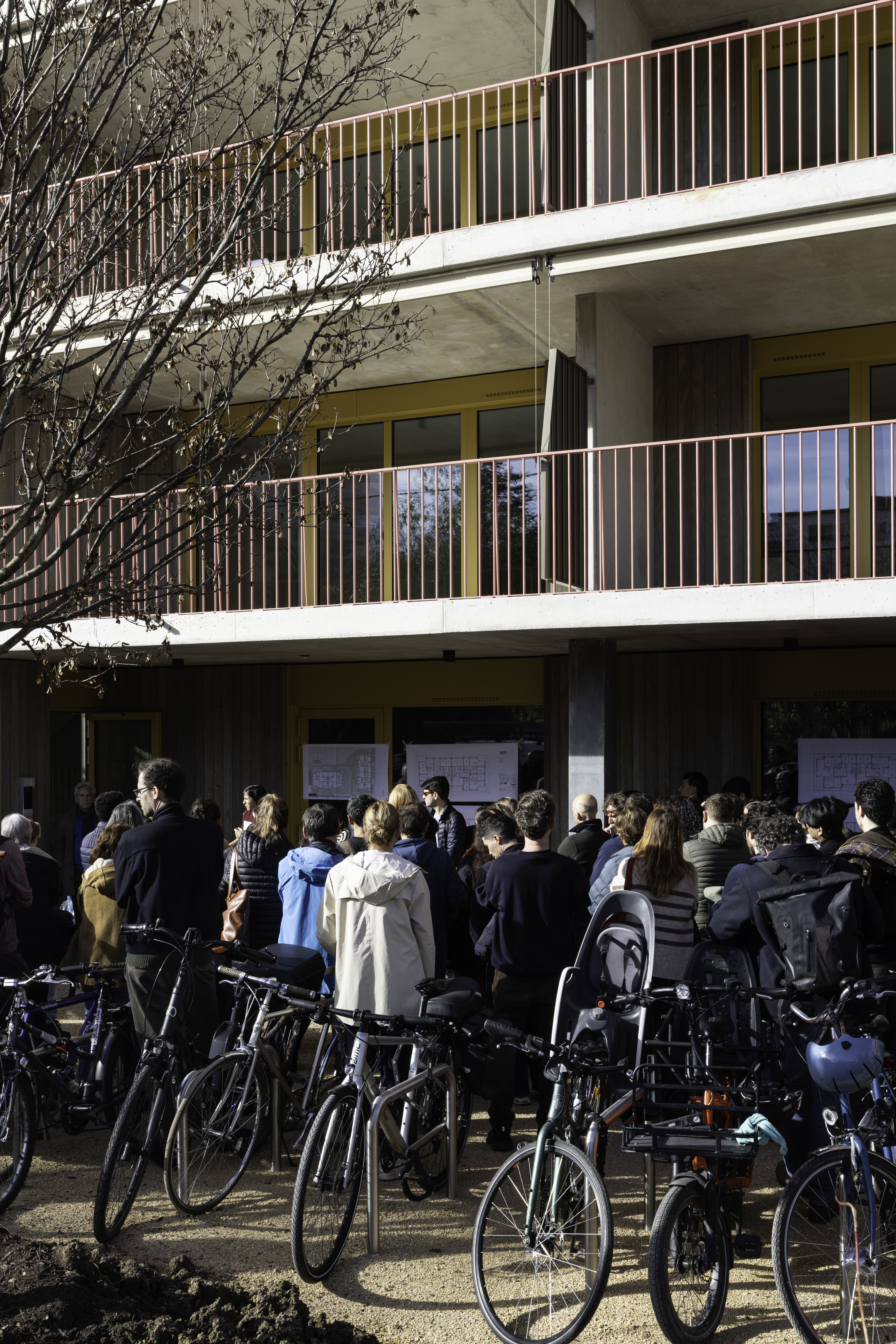 La qualité des aménagements extérieurs participe à la qualité de vie de l’ensemble. Ils accompagnent les habitants jusqu’à l’entrée de leur immeuble à travers différents seuils et filtres qui marquent subtilement le passage de l’espace public à l’espace privé. Les rez-de-chaussée, largement ouverts et traversants, participent à la vie du quartier. Située le long du chemin du Croissant, la salle commune s’affirme comme un lieu d’animation et de rencontre, renforçant le lien entre l’immeuble et son environnement urbain.