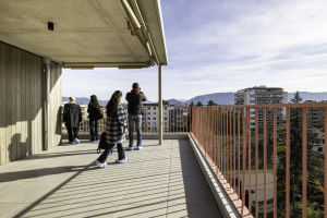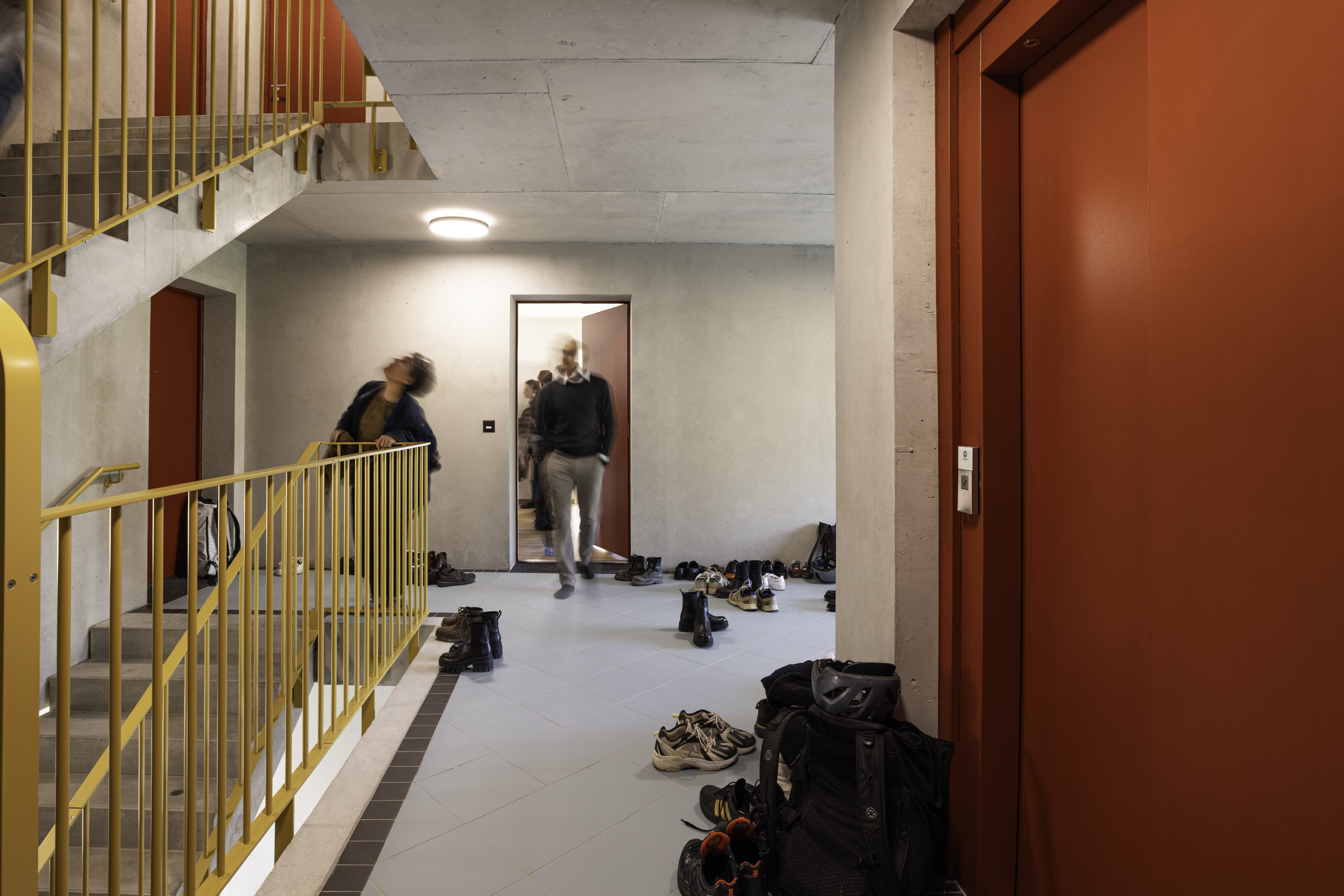 Les deux allées se relient par le rez-de-chaussée traversant qui accueille une salle commune, une buanderie, deux locaux vélos, ainsi que trois logements. Chacune des deux allées bénéficie au 1er étage d’un espace commun à la disposition des habitants. En toiture, une terrasse commune agrémentée de potagers offre un espace de rencontre jouissant du soleil et de la vue.